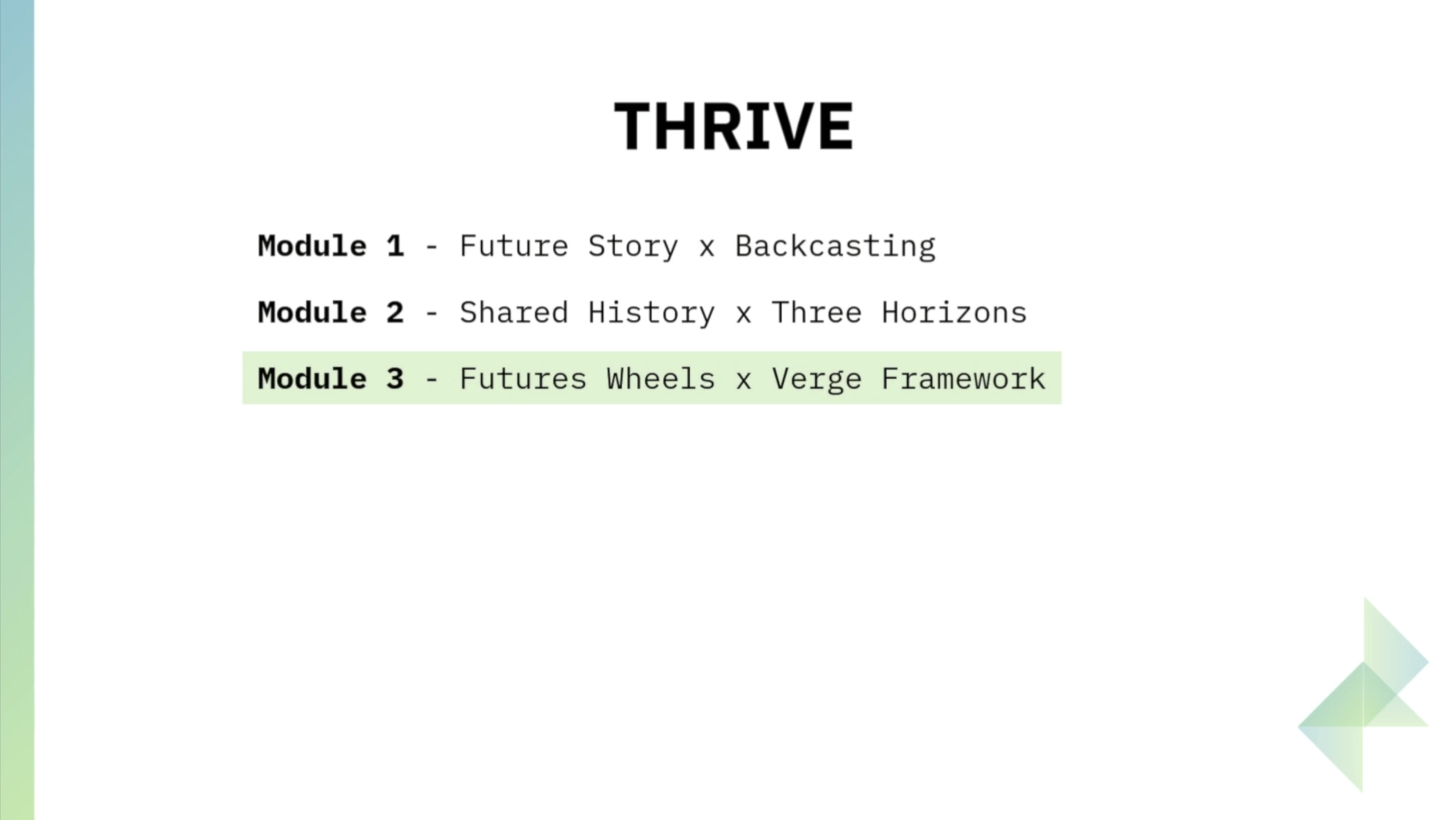Module 3: Futures Wheels and Verge - Explore ripple effects of change and identify weak signals and emerging edges of transformation and innovation.